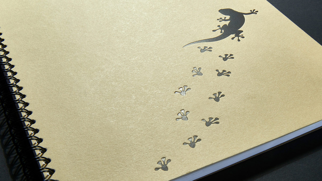 Livret Salamandre - Cahier de note 21x28 cm, 60 feuillets intérieurs sur Offset Blanc 90g impression noire, dessus/dessous sur Materica Kraft 360g, marquage à chaud marron sur le dessus, assemblage de l’ensemble et reliure Wire’o noire.