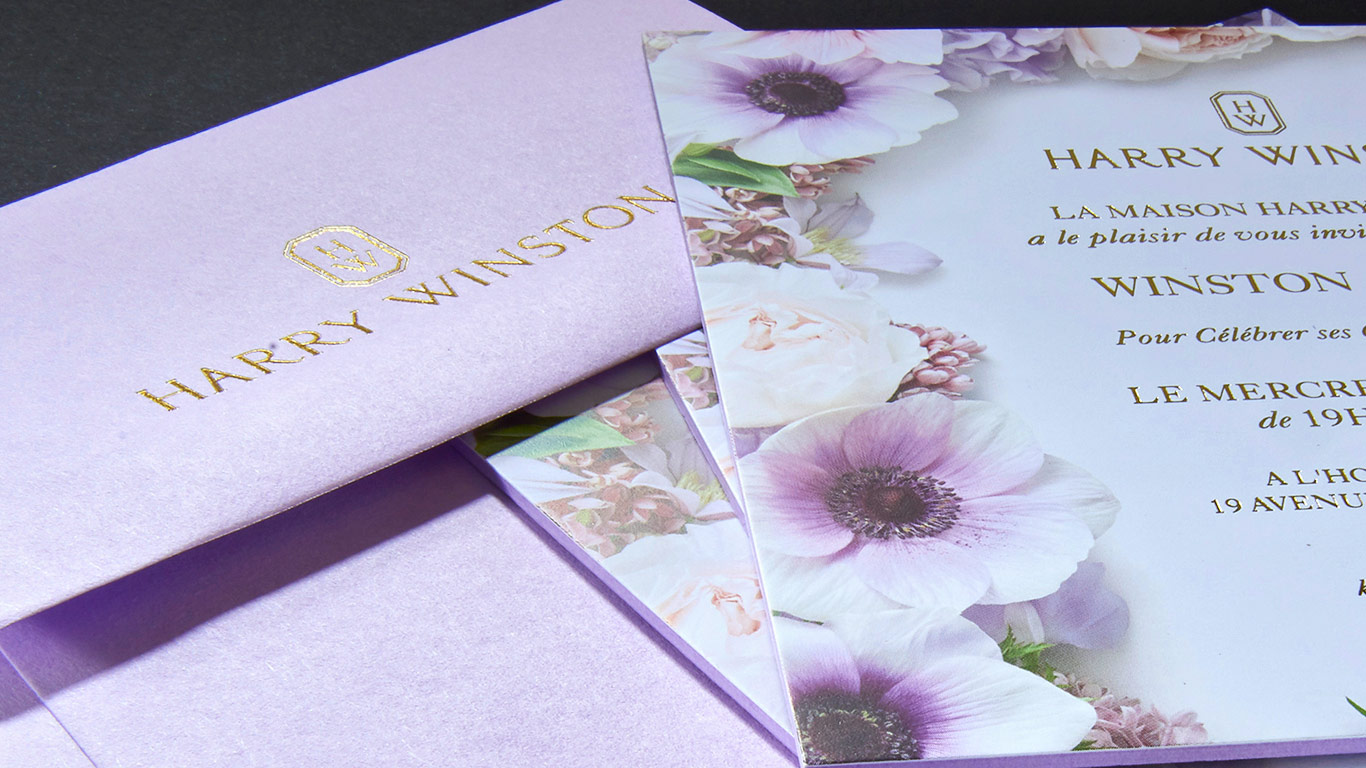Carton d’invitation - impression quadri sur Heaven 42 soft Matt 250g + marquage à chaud or brillant recto seul et contrecollage sur Colorplan Plain Lavander 350g.